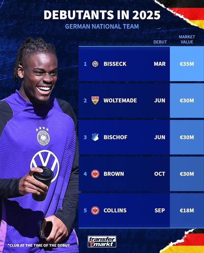 北京时间10月16日,德转列出了2025年代表德国国家队完成首秀的球员,其中包括了国际米兰的中后卫比塞克、今夏高价转会至纽卡斯尔联的沃尔特马德以及拜仁慕尼黑的中场新星比朔夫。